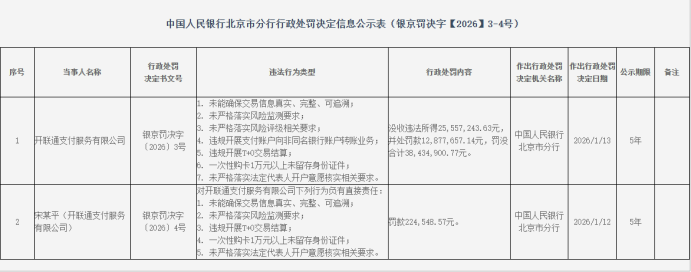 1月21日,央行北京市分行公布的行政处罚决定信息公示表显示,开联通支付服务有限公司因7项违法违规行为被没收违法所得2555.72万元,并处罚款1287.77万元,罚没合计3843.49万元。