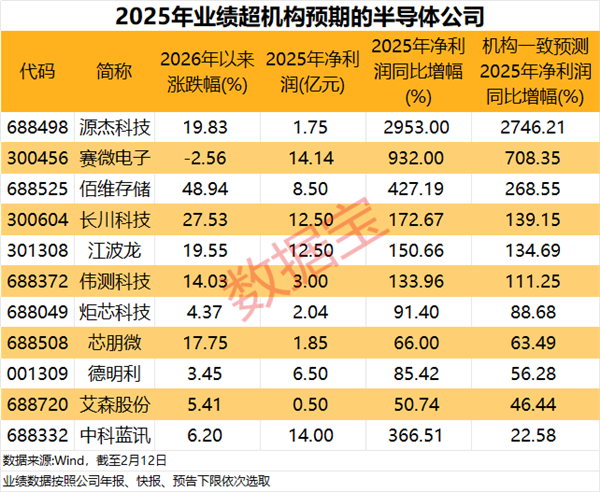 赛微电子2025年业绩大幅扭亏,净利润同比增幅超过930%,远超机构一致预测的净利润增幅;德明利2025年净利润同比增幅下限超过85%,较机构一致预测的2025年净利润同比增幅高出29个百分点以上。