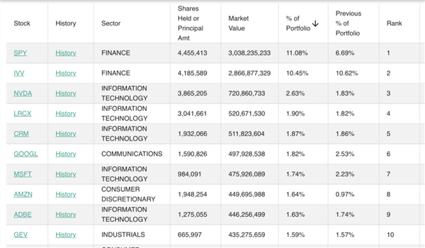 截至2025年第四季度末,桥水的前十大标的分别是标普500指数ETF-SPDR(SPY)、标普500指数ETF-iShares(IVV)、英伟达、拉姆研究、赛富时、谷歌、微软、亚马逊、奥多比、GE Vernova,前十大持仓标的占总市值的36.35%。