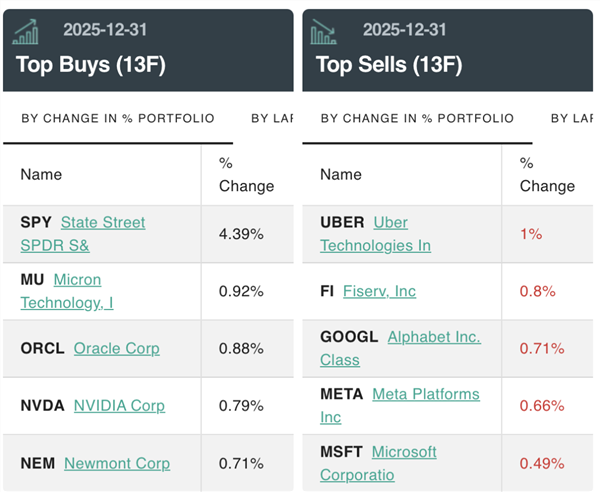 2025年第四季度,桥水基金增持最多的五大标的分别是标普500指数ETF-SPDR(SPY.US)、美光科技、甲骨文、英伟达和全球最大的黄金生产商之一纽蒙特矿业(Newmont Corporation.)。