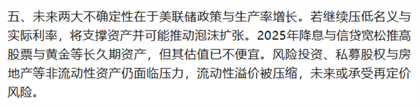 四、关于估值与风险溢价。当前市盈率高企、信用利差处于低位,整体估值偏贵。基于当前收益率与正常生产率假设,长期股票预期回报约4.7%,处于历史低位;债券预期回报约4.9%,股票风险溢价有限。信用利差进一步压缩空间不大,若利率因货币贬值与供需压力上行,股债均可能承压。
