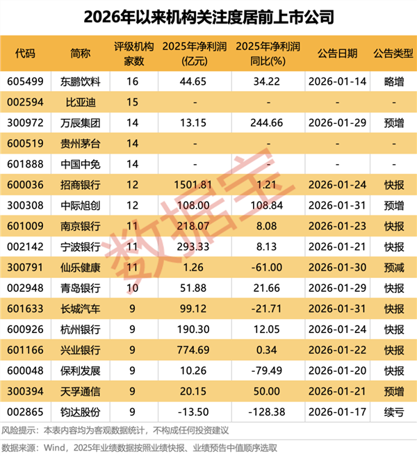 从净利润变动看,以快报数据或预告区间中值统计,万辰集团、中际旭创2025年净利润同比翻倍,增幅依次为244.66%、108.84%;天孚通信、东鹏饮料、青岛银行净利润增速依次为50%、34.22%、21.66%。