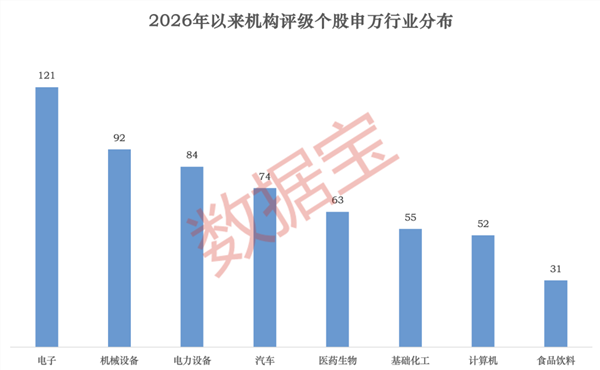 从行业上看,机构评级个股主要分布于电子、机械设备、电力设备行业,上榜个股数量依次为121只、92只、84只;汽车、医药生物、基础化工、计算机等紧随其后,获评级个股数量均在50只以上。