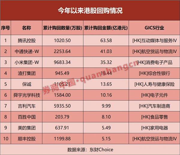 2025年同期数据显示,回购居前十的公司分别为:腾讯、汇丰控股、友邦保险、阿里巴巴、中远海控、保诚、渣打集团、时代电气、安踏体育和百胜中国,回购金额在6.8亿港元以上。