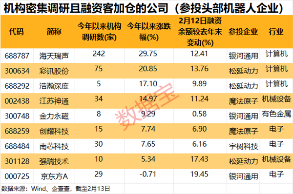 从市场表现来看,这9家公司中,海天瑞声、彩讯股份今年以来涨幅均超过20%,南芯科技、强瑞技术、京东方A表现相对较弱,其中京东方A年内股价小幅下跌,公司年内获得近30家机构调研,2月12日融资余额较去年末增幅超过19%,公司间接参股银河通用。