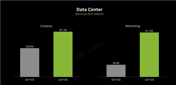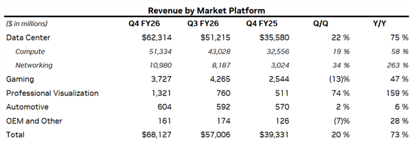 在第四季度中,数据中心业务表现也最优异,收入达到623亿美元,同比增长75%,环比增长22%,占公司总营收比重超过91%。进一步拆分,数据中心中的“计算业务”(主要是GPU产品)贡献513亿美元,同比增长58%;“网络业务”带来110亿美元,同比增长263%。