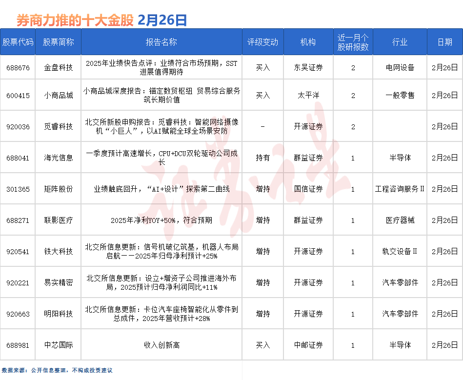 金盘科技最受券商关注,仅2月26日就有国金证券和东吴证券等2份券商研报关注,位居2月26日券商力推股榜首。
