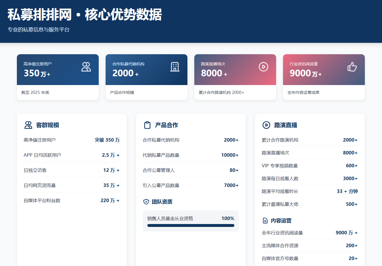 累计合作路演机构2000+,路演直播场次超8000+,拥有600+VIP专享视频,每日观看人数3000+,平均观看时长33+分钟,累计邀请500+著名私募大佬参与分享,为投资者与管理人提供专业投研交流平台;