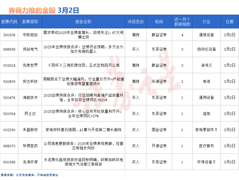 中际旭创最受券商关注,近一个月获招银国际、东吴证券、群益证券等4份券商研报关注,位居3月2日券商力推股榜首。