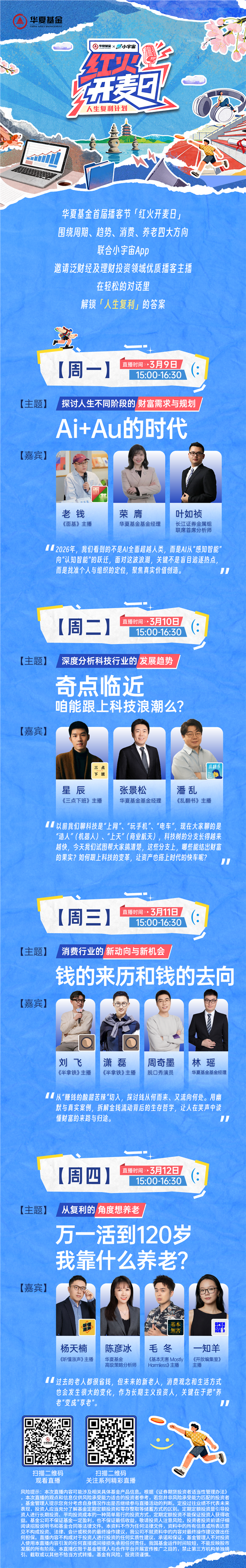 本次播客节以“探索人生复利”为核心命题,围绕周期、趋势、消费、养老四大方向设置四大品牌论坛,邀请泛财经及理财投资领域的优质播客主播,与华夏基金投研团队展开深度对话。