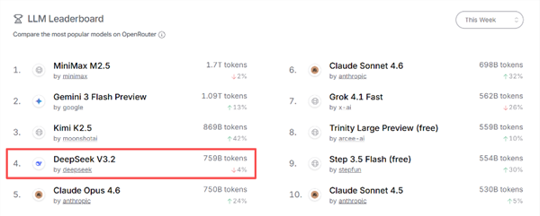 目前,全球最大的大模型API聚合平台OpenRouter数据显示,DeepSeek V3.2稳居Token消耗量前十阵营。此前记者在《Token出海或迎风口!Kimi+DeepSeek+智谱+MiniMax,筹码集中概念股出炉》中写道,今年2月DeepSeek的Token消耗量达到3万亿,位居大模型第4位。