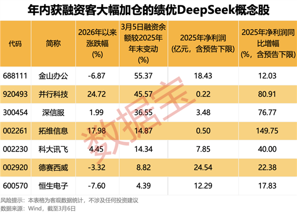 从融资资金来看,上述45只DeepSeek概念股3月5日融资余额合计622.75亿元,较2025年年末增加近4%;半数融资融券标的获加仓,加仓幅度居前的有金山办公、每日互动、拓尔思,3月5日融资余额较2025年年末增幅均超过50%。