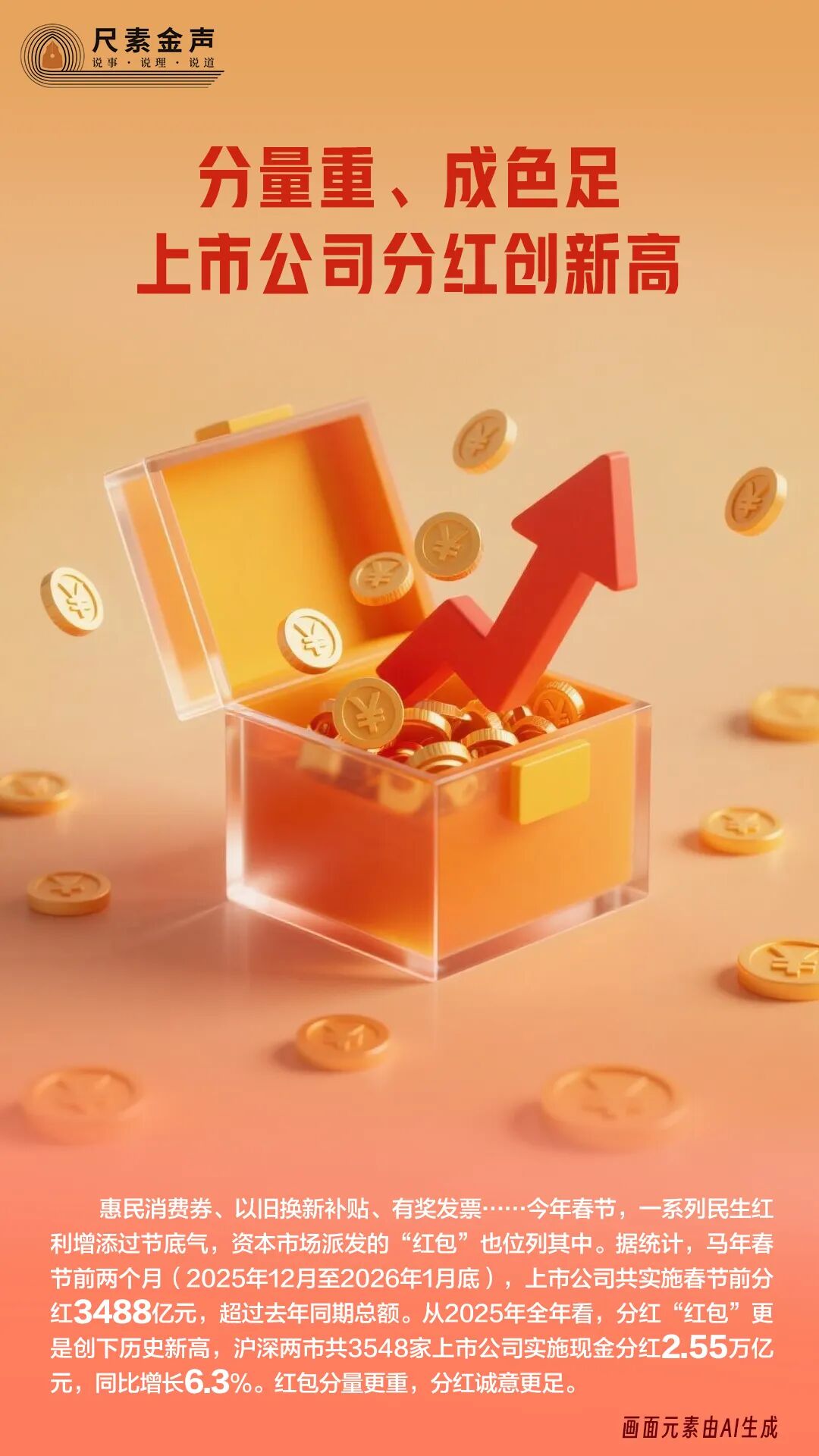 惠民消费券、以旧换新补贴、有奖发票……今年春节,一系列民生红利增添过节底气,资本市场派发的“红包”也位列其中。据统计,马年春节前两个月(2025年12月至2026年1月底),上市公司共实施春节前分红3488亿元,超过去年同期总额。从2025年全年看,分红“红包”更是创下历史新高,沪深两市共3548家上市公司实施现金分红2.55万亿元,同比增长6.3%。红包分量更重,分红诚意更足。