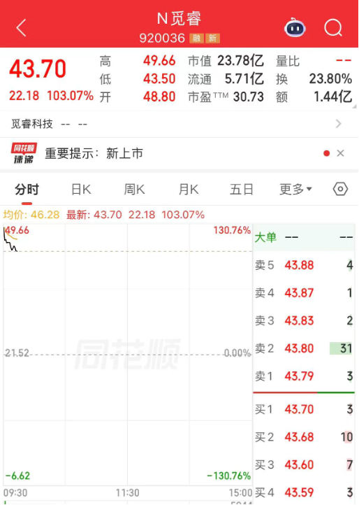 N觅睿(920036)今日在北交所上市,开盘价48.80元,上涨126.77%。