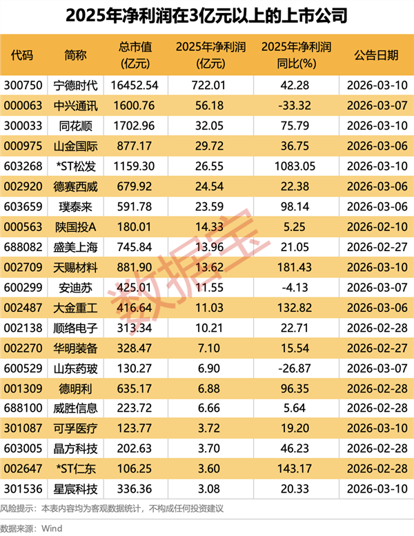 据证券时报·数据宝统计,截至3月9日,已有47家A股上市公司发布了2025年年度报告。从净利润规模来看,共计21家全年净利润在3亿元以上。宁德时代、中兴通讯、同花顺暂列前三,净利润依次为722.01亿元、56.18亿元、32.05亿元;山金国际、*ST松发、德赛西威、璞泰来净利润均在20亿元以上。