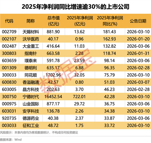 从净利润变动看,共计14家公司2025年全年净利润同比增幅逾30%。天赐材料、沃华医药、大金重工、指南针净利润实现翻倍增长。其中天赐材料增幅最高,为181.43%。