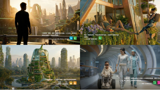 《未来不可回收》AI短片以“一座城市,十重未来”为主题,质感细腻,节奏张弛有度:植物覆盖的建筑立面与立体绿化廊道构成新的城市天际线,人与动植物共享城市街道,不同年龄、种族、能力与背景的人群在同一城市空间中和谐生活。文学想象与影像技术在该短片中自然衔接、相互成就。