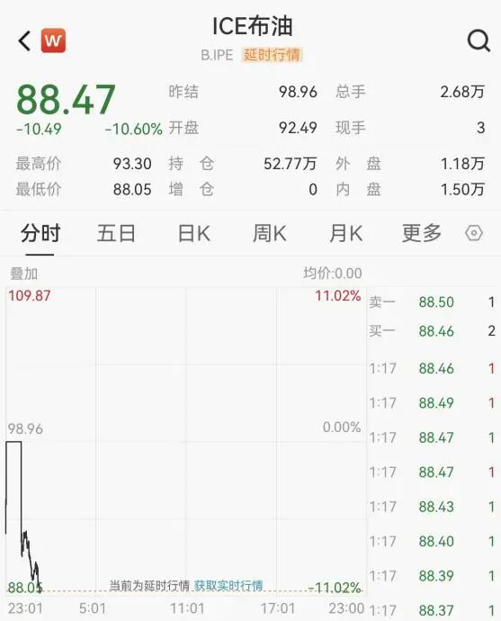截至发稿,布伦特原油失守89美元/桶,最低报88.05美元/桶,日内跌10.6%。而就在昨日,布油曾站上119.5美元/桶。