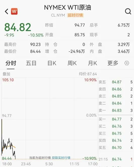 同时,WTI原油期货日内大跌超10%,跌破85美元/桶,现报84.82美元/桶。