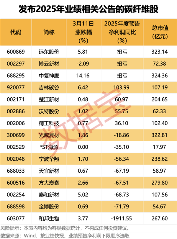 据证券时报·数据宝统计,A股中碳纤维概念股共有23只,15股发布了2025年度业绩相关公告。按业绩快报、业绩预告净利润下限顺序计算,博云新材、远东股份、中复神鹰预计扭亏为盈,吉林碳谷、楚江新材、沃特股份、精工科技净利润均实现同比增长。