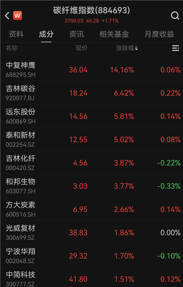 受此消息影响,3月11日碳纤维概念午后上涨,概念指数盘中最高涨幅达到2.27%,收盘上涨1.71%,中复神鹰、吉林碳谷、远东股份、泰和新材收盘涨幅均在5%以上。