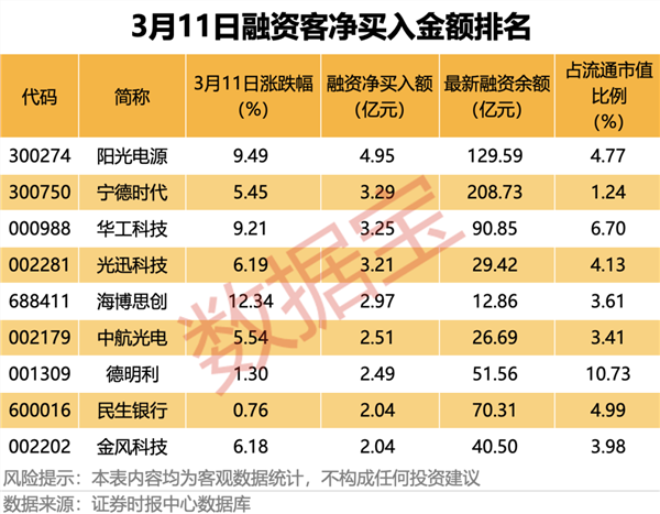 据证券时报·数据宝统计,3月11日,共40股融资净买入额均超1亿元。储能概念龙头阳光电源融资净买入额居首,当日净买入4.95亿元。