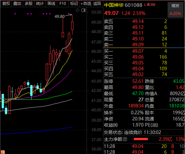 今日早盘,周期股继续大涨,煤炭指数大涨3.7%。其中,中国神华(601088)A股突破49元/股大关,再创历史新高,总市值逼近万亿元。