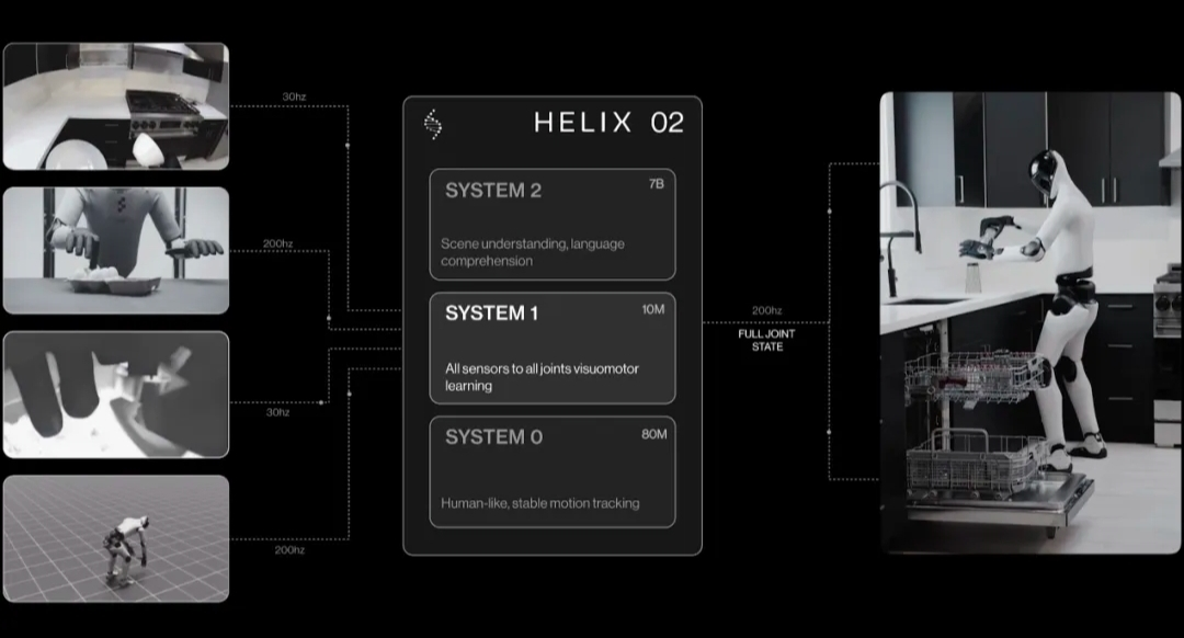 支撑这套流畅动作的,并非传统意义上的死板指令,而是Figure自主研发的具身大脑——Helix02,它的出现打破了“提前写好动作”的传统范式。