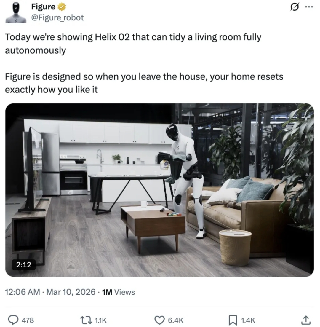 2026年3月10日,Figure发布的Helix02系统视频,向公众展示了什么是真正的完全自主、端到端全流程家务能力。与春晚舞台上对齐剧本的表演不同,这次Figure机器人自主进入了充满随机性的真实客厅。