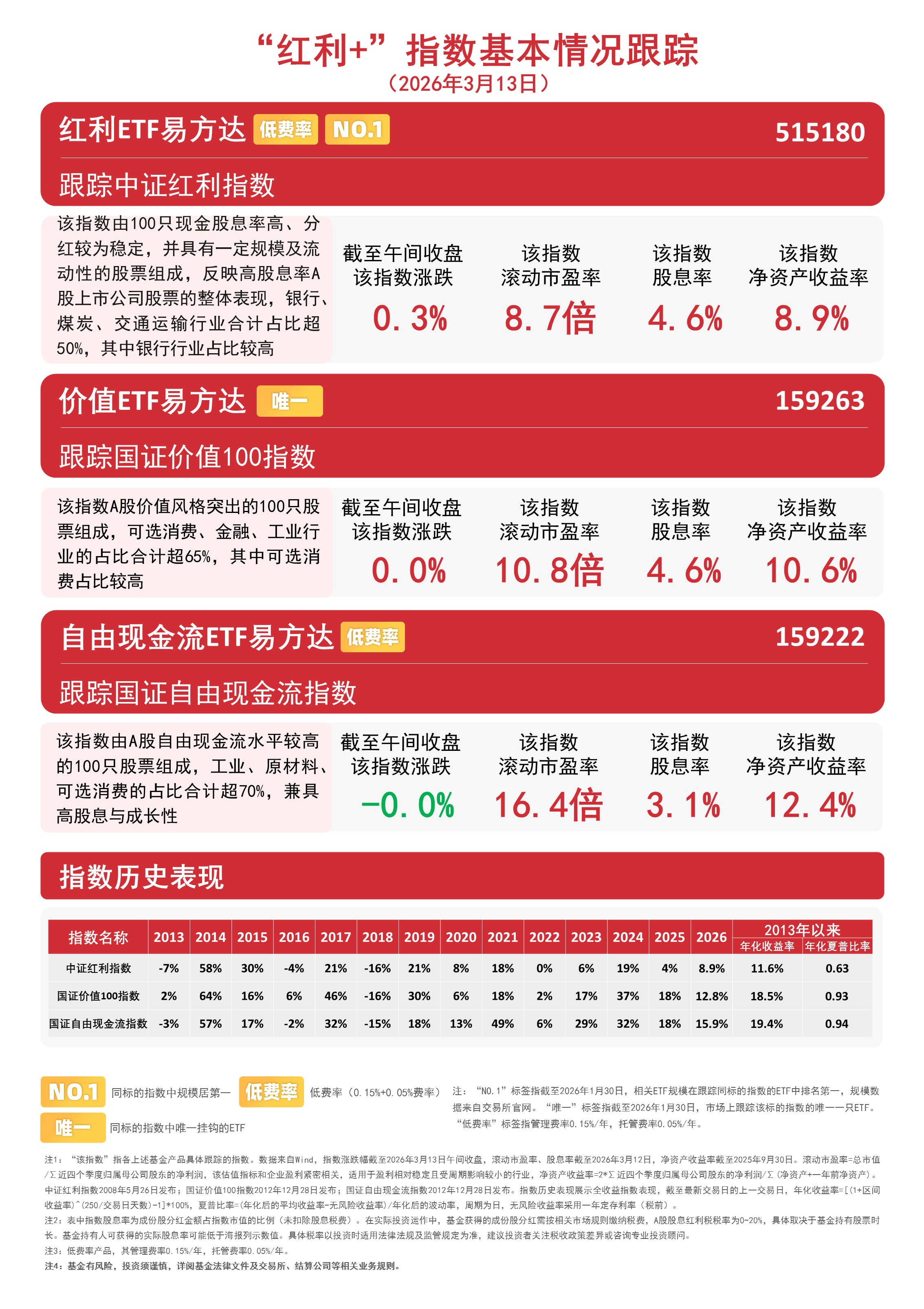 截至午间收盘,中证红利指数上涨0.3%,国证价值100指数上涨0.02%,国证自由现金流指数下跌0.02%,相关ETF中,价值ETF易方达(159263,联接基金A/C:025497/025498)和自由现金流ETF易方达(159222,联接基金A/C:024566/024567)早盘分别获4800万份和2900万份净申购。