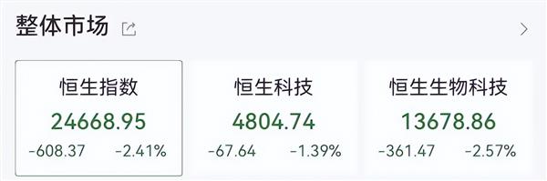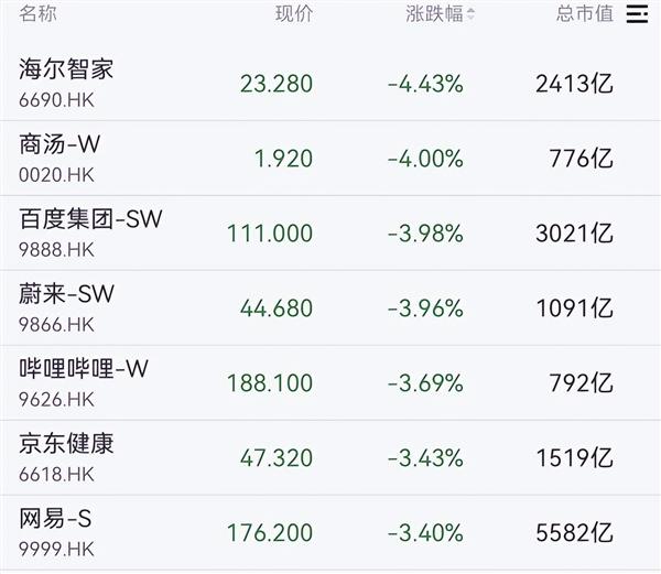 港股方面,恒生指数跌超2%,恒生科技指数跌超1%,海尔智家、商汤、百度集团等跌幅居前。