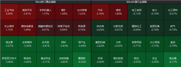 从板块来看,煤炭板块逆市走高,机器人、汽车、锂矿板块表现活跃;贵金属板块跌幅居前,农业、餐饮旅游、航空板块震荡调整。