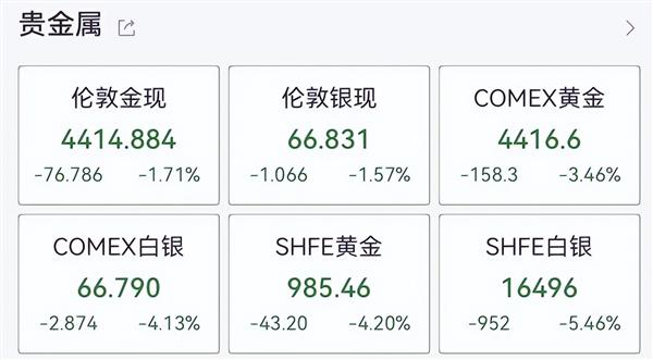 消息面上,现货黄金、现货白银同时走低。其中,现货黄金一度跌破4400美元/盎司,现货白银向下跌破67美元/盎司。
