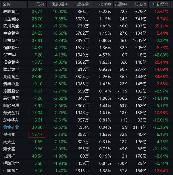 贵金属概念股持续下挫,赤峰黄金一字跌停,山金国际、四川黄金、中金黄金、山东黄金、晓程科技、湖南白银等大跌。