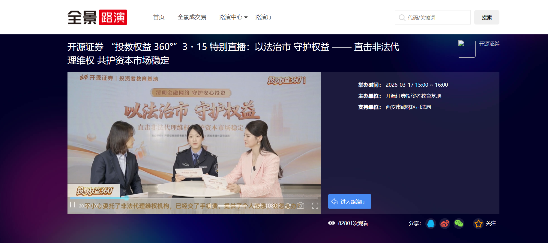 线上,策划开展“3・15守护投资安全——权益保护大闯关”有奖知识问答活动,以趣味化、互动化形式普及投资者维权、防非等知识,覆盖投资者600余人。打造“投教权益 360°”系列品牌活动,联合碑林区司法局推出“以法治市 守护权益——直击非法代理维权 共护资本市场稳定”主题直播,深入剖析非法代理维权常见套路、现实危害及相应法律后果,引导投资者认清非法代理维权陷阱,依法理性维护自身合法权益,直播累计观看量突破8万次;同时,将直播重点内容拆解制作成“非法代理维权解读三部曲”系列视频,通过多平台投放,进一步扩大投教宣传覆盖面与影响力。