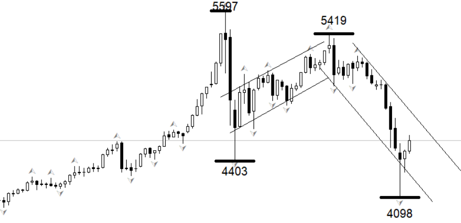 行情方面,黄金在1月29日和3月2日,分别形成两个显著高点5597和5419,高点依次降低,形成典型的双顶/头肩顶结构,预示着未来中长期趋势可能已经由多转空。3月初以来,下跌波段运行于图中通道线内部,本周一K线击穿通道下轨,但在收盘时反弹至通道内部。如果消息面没有突发扰动,未来行情极有可能向通道上轨移动。