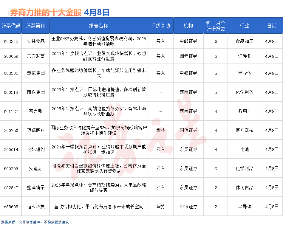 除了上述个股外,还有丽珠集团、赛力斯、迈瑞医疗、亿纬锂能、安迪苏、盐津铺子、恒玄科技等多股备受券商关注。