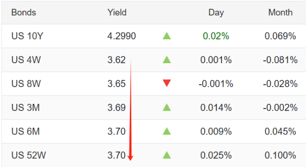 上图是美债收益率汇总图。从一个月期到一年期,美债收益率保持着从3.62%到3.7%的上升排序,意味着美联储在自四月份开始的未来12个月,大概率将保持紧缩货币政策。同时我们也注意到,未来12个月的利率升幅低于8基点,而美联储一次加息的幅度经常在25基点。所以美联储虽然在未来一年里存在紧缩货币政策的倾向,但付诸加息操作的概率较低。