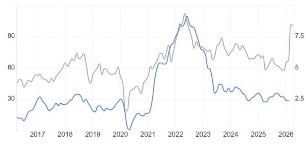 ATFX:3月份,美国和伊朗之间的战争正处于白热化,国际油价在3月初的时候就已经飙高到110美元上方,即便下旬国际油价有所回落,但整体报价都在90美元附近。美国的CPI数据对国际油价的变动异常敏感,高油价势必导致高通胀。