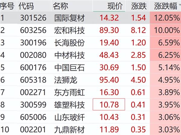 建材板块同步走强,玻纤概念股火热。宏和科技涨停,总市值站上800亿元。国际复材涨超10%,长海股份、中国巨石等纷纷大涨。