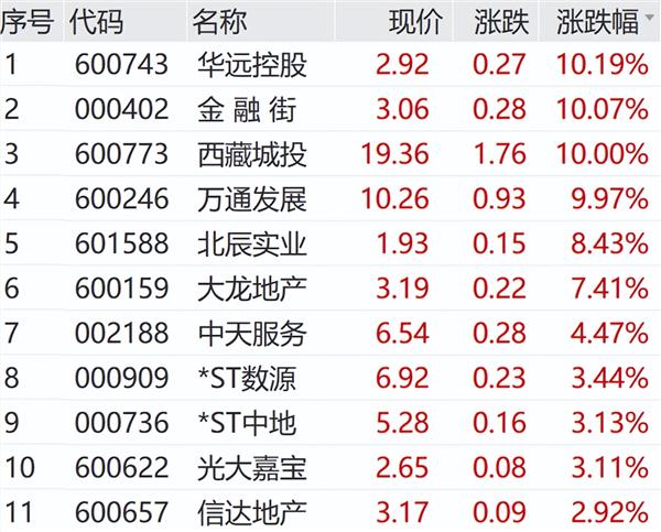 4月13日上午,A股房地产板块直线拉升。华远控股5连板,金融街2连板,西藏城投、万通发展等多股涨停,北辰实业、大龙地产等跟涨。