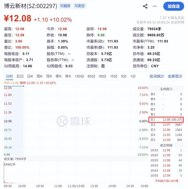 4月13日,博云新材在竞价阶段即涨停,报12.08元/股。截至发稿,买一超100万手。