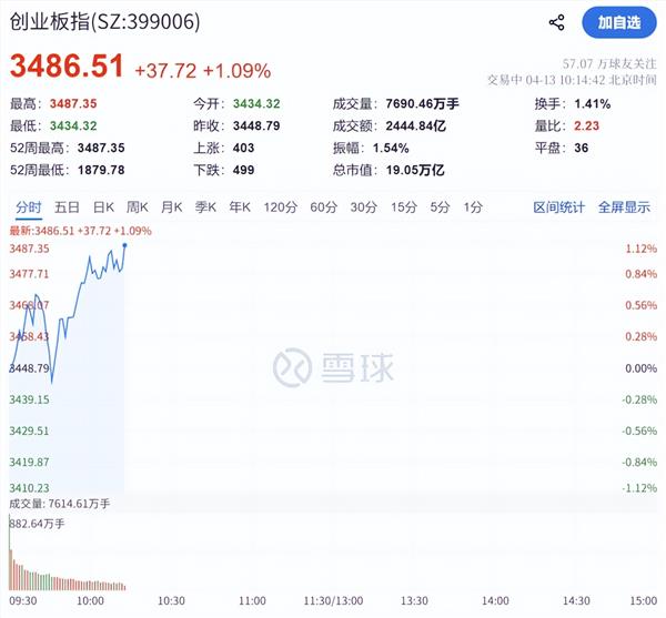 4月13日,A股开盘小幅走低:上证指数跌0.38%,深证成指跌0.53%,创业板指跌0.42%。随后,市场震荡回暖。截至发稿,创业板指涨超1%,上证指数跌幅有所收窄。