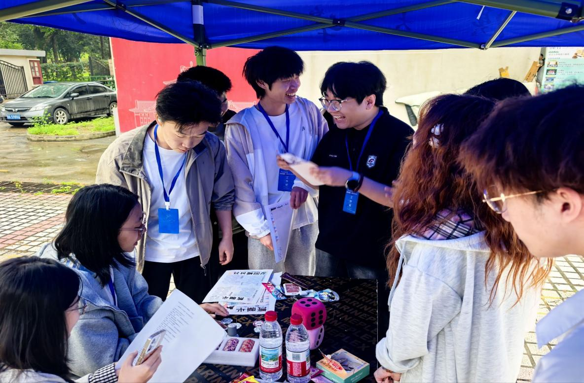 现场活动亮点纷呈,趣味与专业兼备。经管院社指摊位打造了两大特色游戏:“风险骰子” 让同学们化身投资者,在沉浸式博弈中理解风险与收益的经济学逻辑;“经济常识快问快答” 分设难易两档题目,兼顾了不同专业背景同学的参与体验。除此之外,剧本杀、猜歌谜、台词接龙等各具社团特色的游戏轮番上演,师生们穿梭在各个摊位之间,在欢声笑语中完成挑战、收集印章,现场氛围持续高涨。