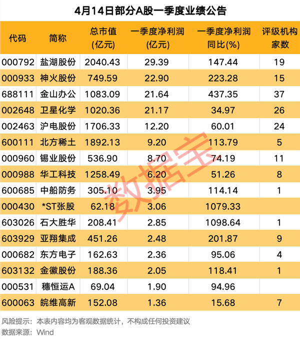 4月14日,多家行业龙头公司发布一季报相关公告,包括北方稀土、金山办公、神火股份等。
