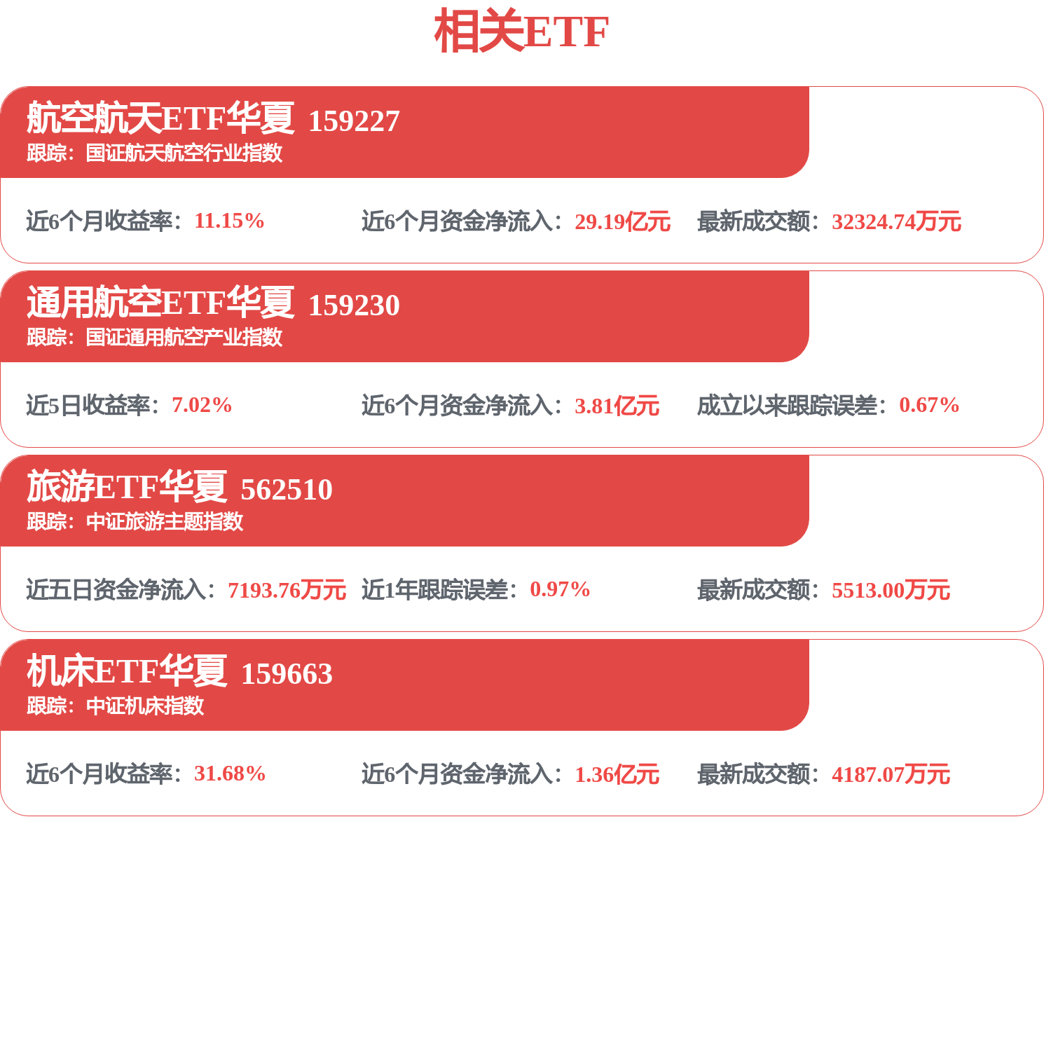 通用航空ETF华夏(159230,联接024912/024913)跟踪国证通用航空产业指数,以低空经济为核心,覆盖航材及基础设施、飞行器制造、运营服务及场景应用等行业,低空经济含量87.69%,无人机含量90.03%,商业航天含量65.22%,助力投资人把握商业航天行情。