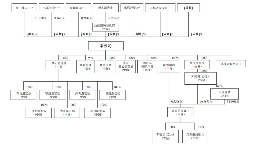 此次赴港上市前,汕头潮鸿基有限公司为潮宏基控股股东,持有其28.55%的股份;廖木枝、林军平及廖创宾分别持有该投资平台51.59%、9.17%及8.20%的股份,三人互为一致行动人。此外,廖创宾、廖木枝及林军平还各自直接持有潮宏基约3.04%、0.07%及0.01%的权益,三人合计持股约31.67%,为公司单一最大股东集团,对公司拥有绝对控制权。