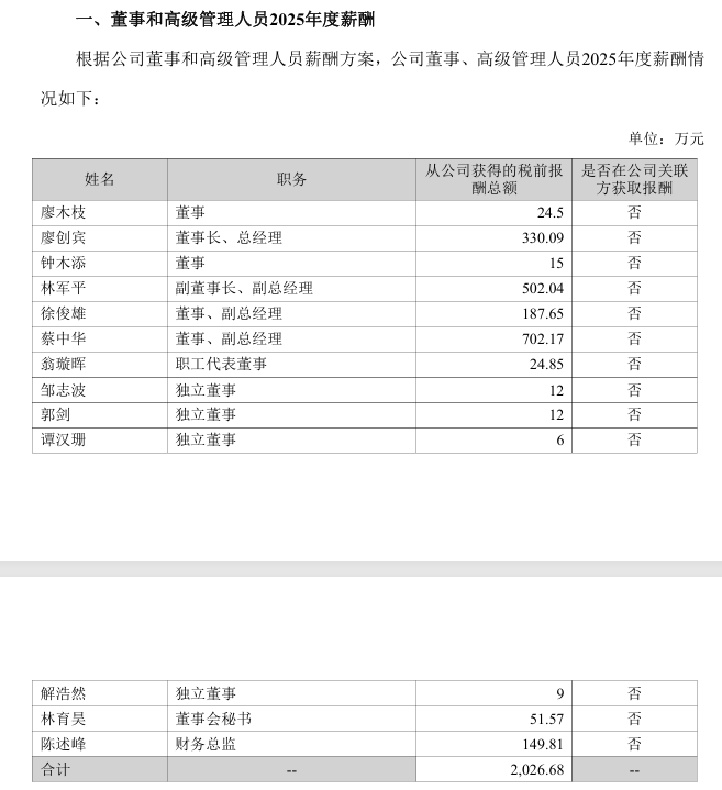 其中,廖创宾2025年度薪酬为330.09万元,较上一年增加136.62万元,增幅达70.62%;林军平2025年度薪酬更是高达502.04万元,较上一年增加267.36万元,增幅飙升至112.22%,两人薪酬涨幅均远超公司整体业绩增长水平。