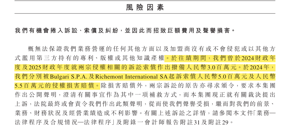 对于两起侵权诉讼,潮宏基表现得颇为“淡定”,称已在2024、2025两个财政年度计提诉讼拨备人民币300万元;还表示赔偿金额不大,对集团资产影响较小,即便停止相关产品销售,也不会对珠宝业务收益产生明显影响。