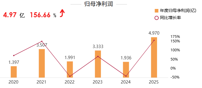 与毛利率持续下滑相伴的,是净利润的“过山车式”波动。2023年至2025年,潮宏基归母净利润分别为3.33亿元、1.94亿元、4.97亿元,呈现明显的“V”字形结构。